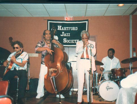 | From left to right: Mark Elf, Walter Booker, Bill Hardman & LeRoy Williams. The Bill Hardman Quartet at the Hartford, Ct Jazz Society Concert in 1985 |